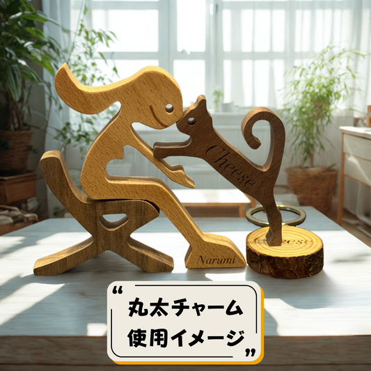 ペットと人の木の彫刻 + 名入れ丸太チャーム付き <名入れ無料> 木のインテリア